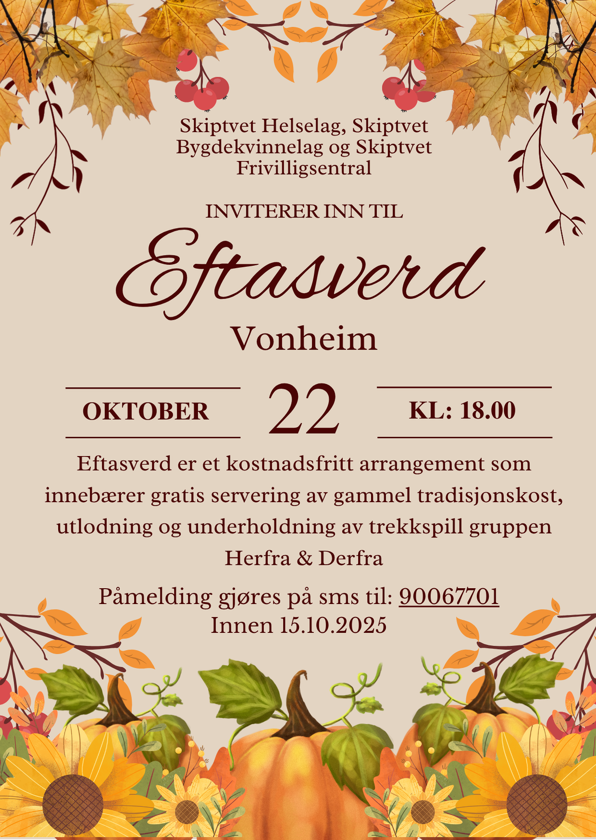 Frivilligsentralen, Bygdekvinnelaget og Helselaget inviterer inn til Eftasverd i Vonheim, onsdag 22.10.25, Kl 18.00