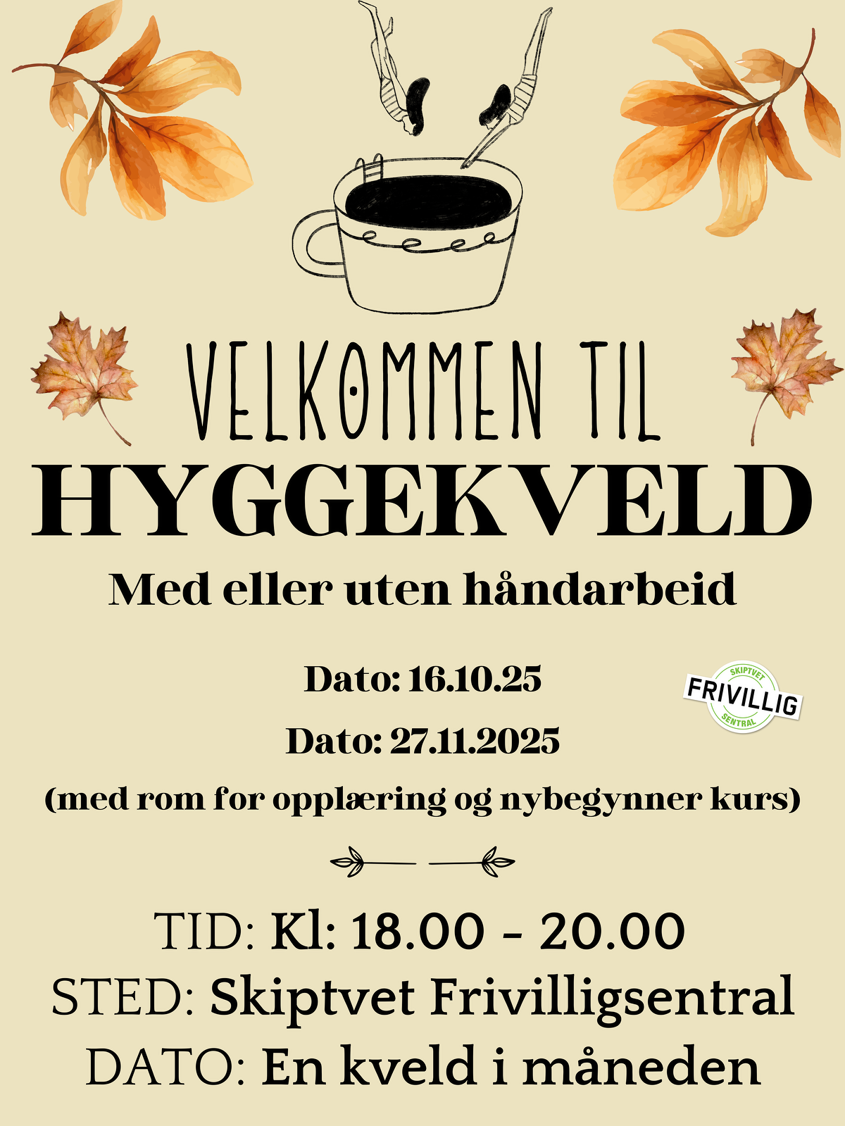 Hyggekveld er en åpen og sosial møteplass for alle som ønsker å komme! Her er det rom for både drevne og nybegynnere, damene vil kunne gi opplæring i ulike type håndarbeid. Eller om du kun vil komme å slå av en prat er det rom for det og. Velkommen