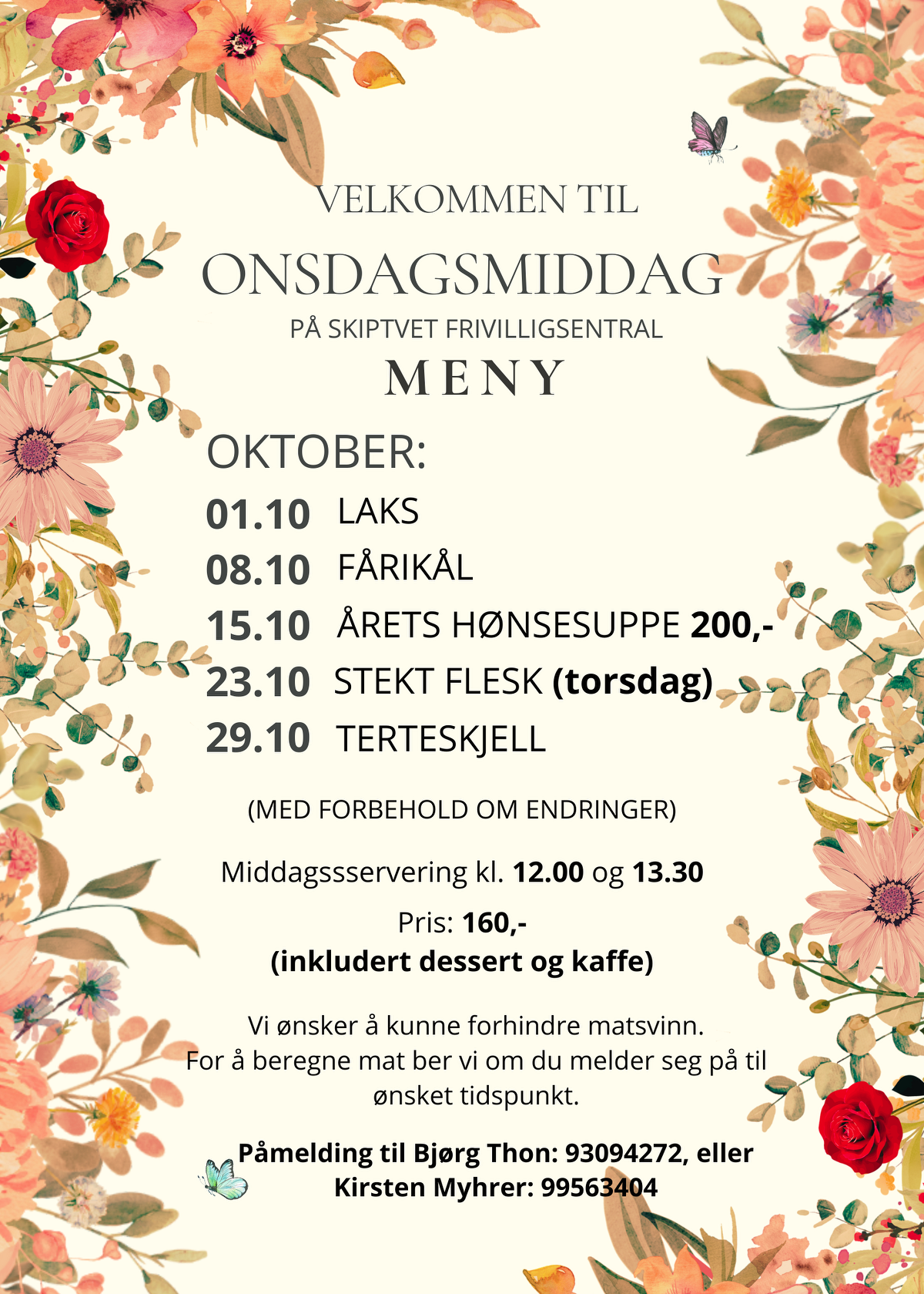 MIDDAGSPLAN ONSDAGER PÅ SKIPTVET FRIVILLIGSENTRAL