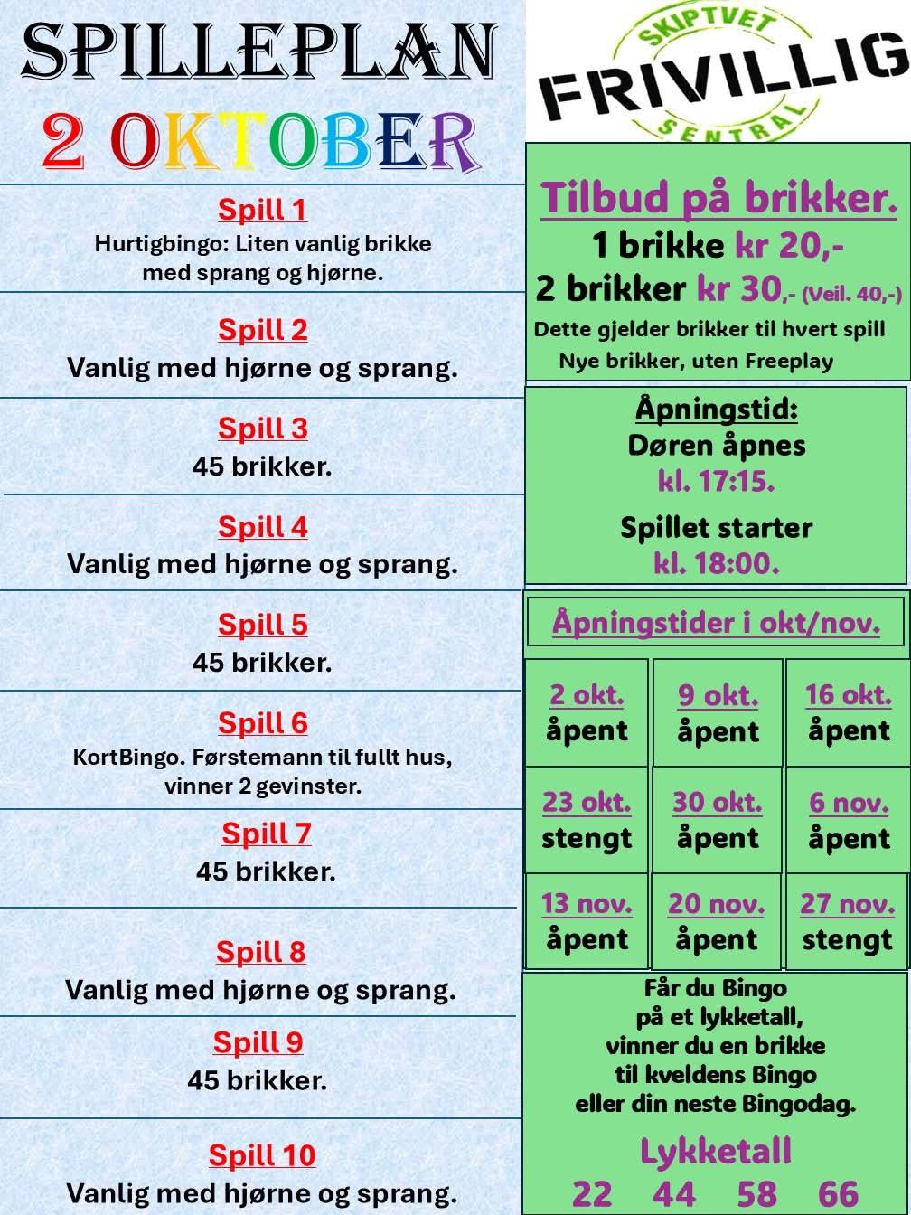 TORSDAGSBINGO PÅ SENTRALEN! -Spilleplan for Oktober