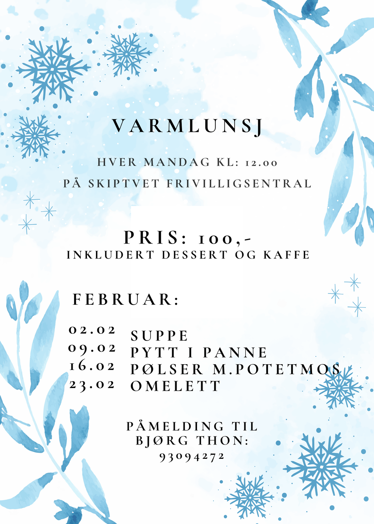 Hver onsdag serveres det middag, inkludert dessert og kaffe til 210,- på sentralen. I tillegg til våre vanlige kafe varer, gjenbruksbutikk og utlånssentral.