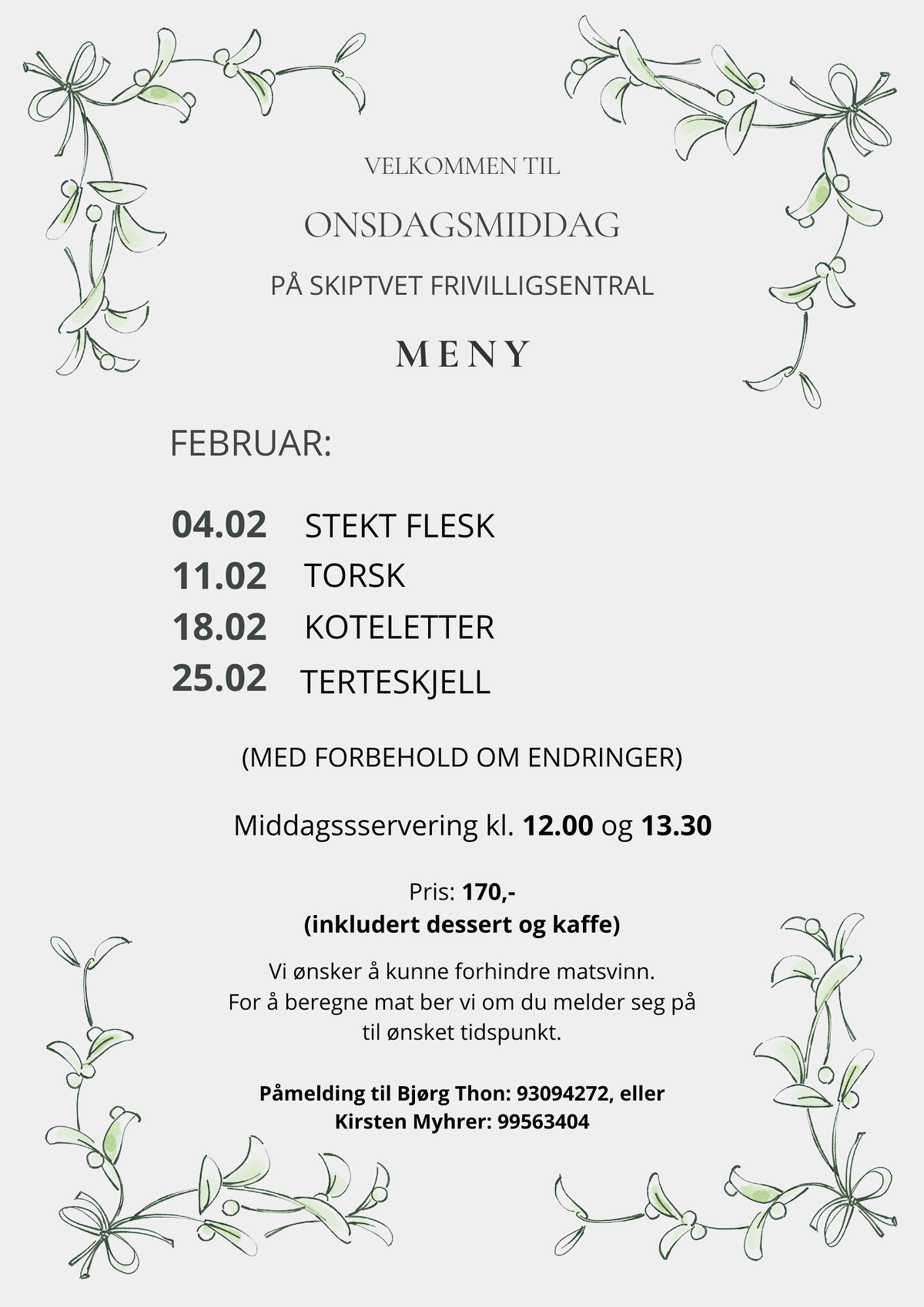 Hver onsdag serveres det middag, inkludert dessert og kaffe til 210,- på sentralen. I tillegg til våre vanlige kafe varer, gjenbruksbutikk og utlånssentral.