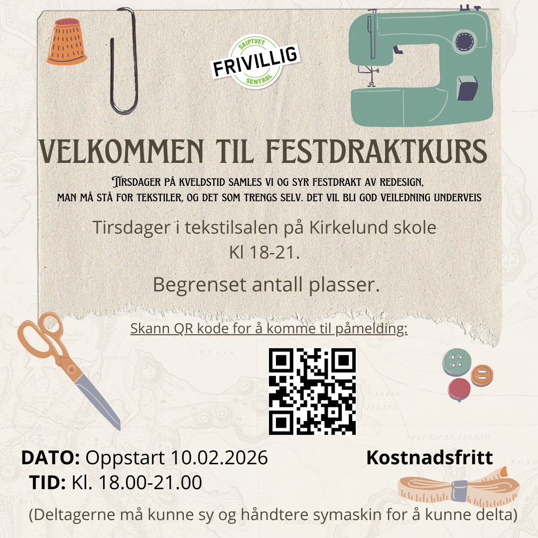 Velkommen til festdraktkurs med Skiptvet Frivilligsentral đ€ Se QR -Kode pĂ„ plakat for pĂ„melding.
