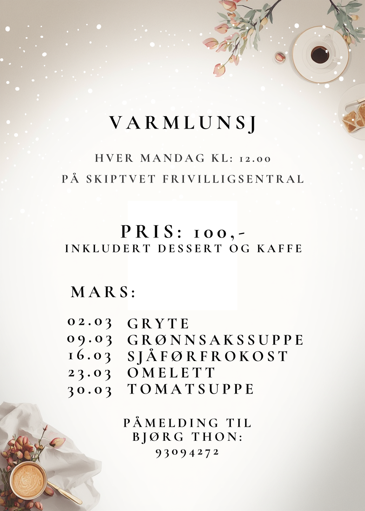 Hver onsdag serveres det middag, inkludert dessert og kaffe til 170,- på sentralen. I tillegg til våre vanlige kafe varer, gjenbruksbutikk og utlånssentral.