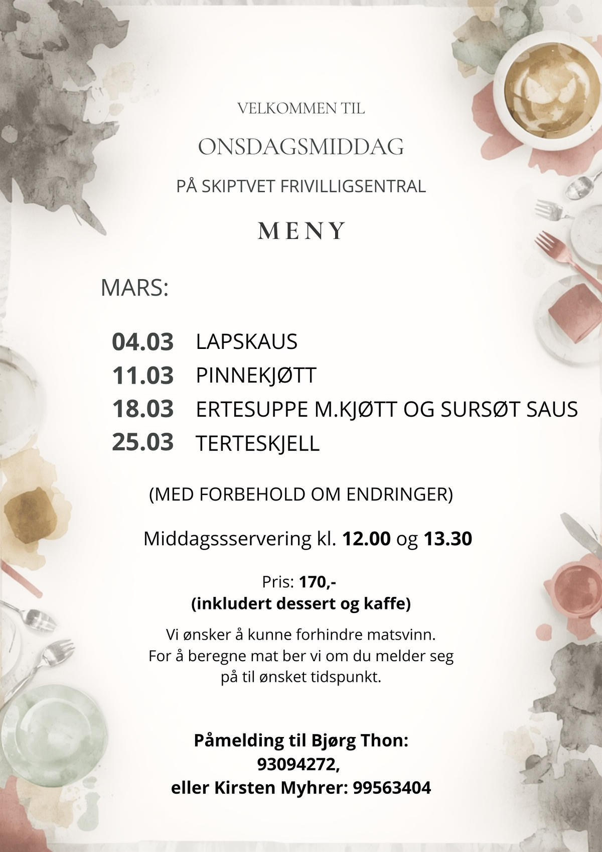 Hver onsdag serveres det middag, inkludert dessert og kaffe til 170,- på sentralen. I tillegg til våre vanlige kafe varer, gjenbruksbutikk og utlånssentral.