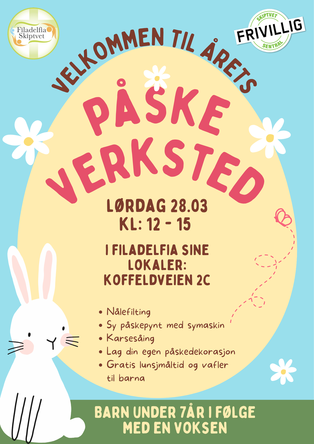 Velkommen til årets påskeverksted. I år samarbeider vi med Filadelfia og vil derfor benytte oss av deres flotte lokaler. Koffeldveien 2C (rett bak Skiptvet bibliotek)Skiptvet Frivilligsentral samarbeider i år med Filadelfia Skiptvet og steller derfor i stand påskeverksted for tredje året på rad 🐣