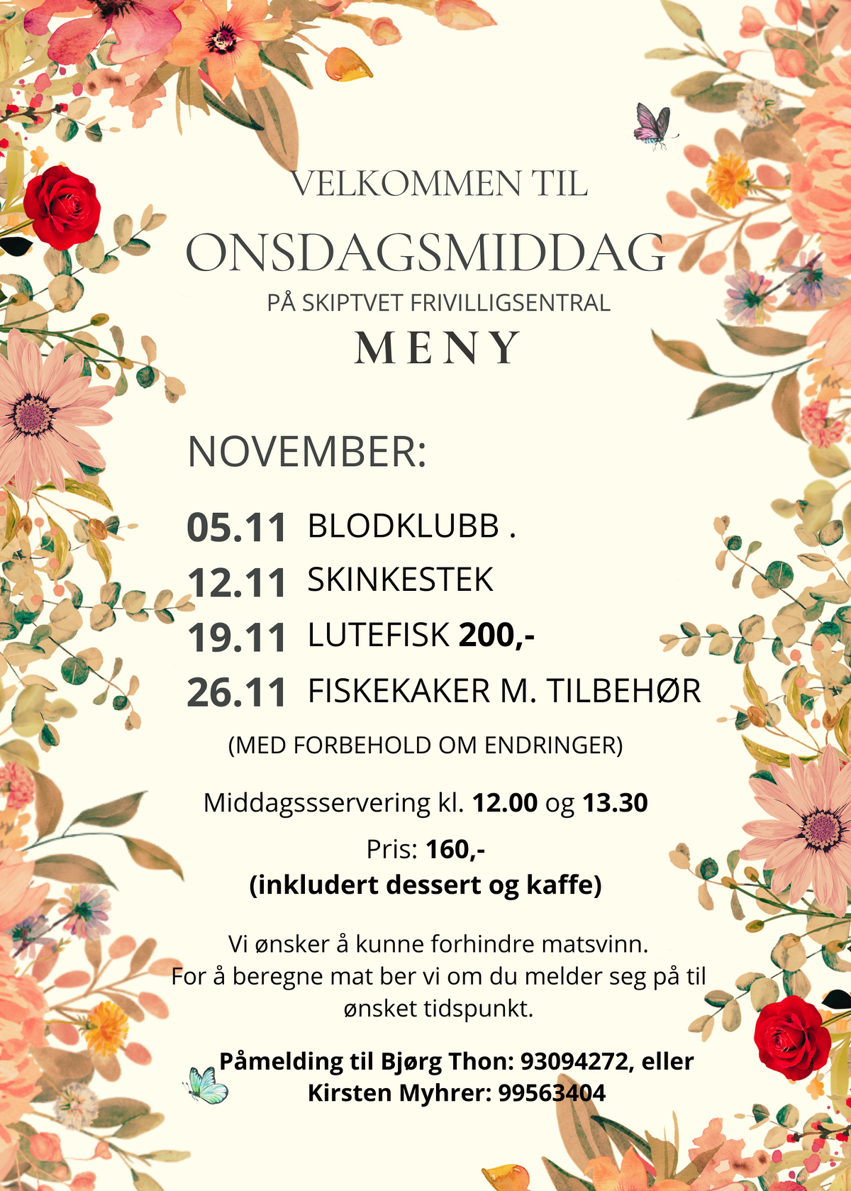 MIDDAGSPLAN ONSDAGER PÅ SKIPTVET FRIVILLIGSENTRAL